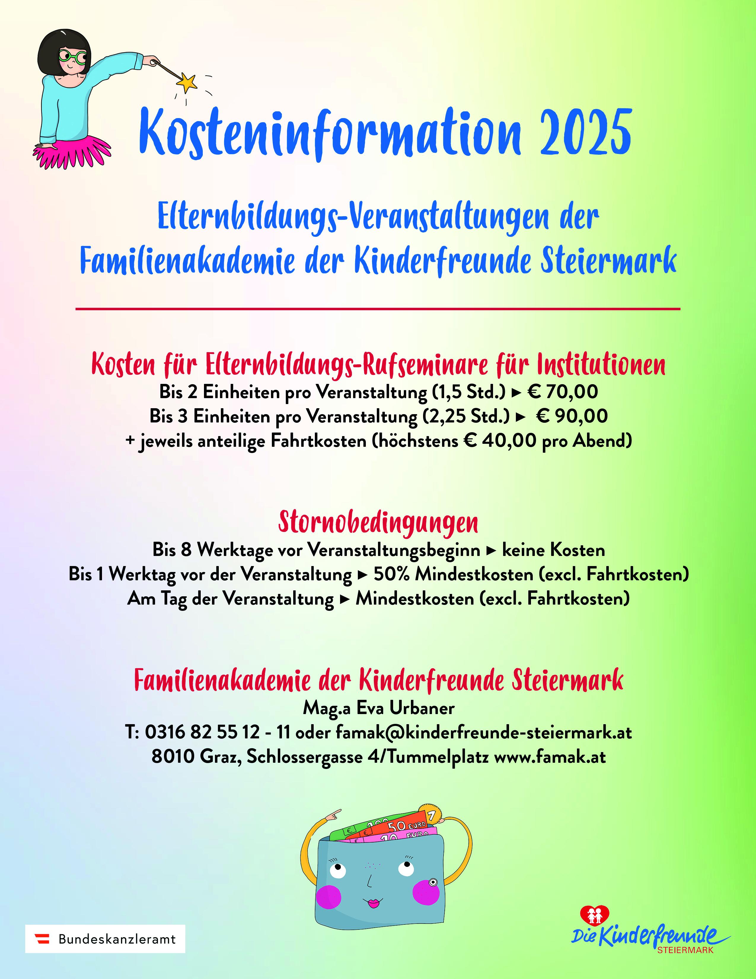 Die Familienakademie organisiert kompetente Fachexpert:innen bzw. Elternbildner:innen, unterstützt Sie bei der Bewerbung und stellt gegebenenfalls Handouts zur Verfügung. Ihr Kostenbeitrag als Veranstalter beläuft sich auf ca. € 70,- bis € 90,- pro Veranstaltung und ggf. bis zu € 35,- Fahrtkostenpauschale.